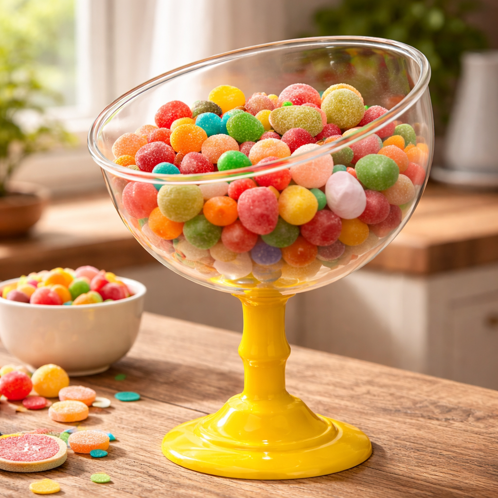 Caramelera en forma de copa con pie. Ideal para decorar mesas principales con dulces, frutas o galletas.
